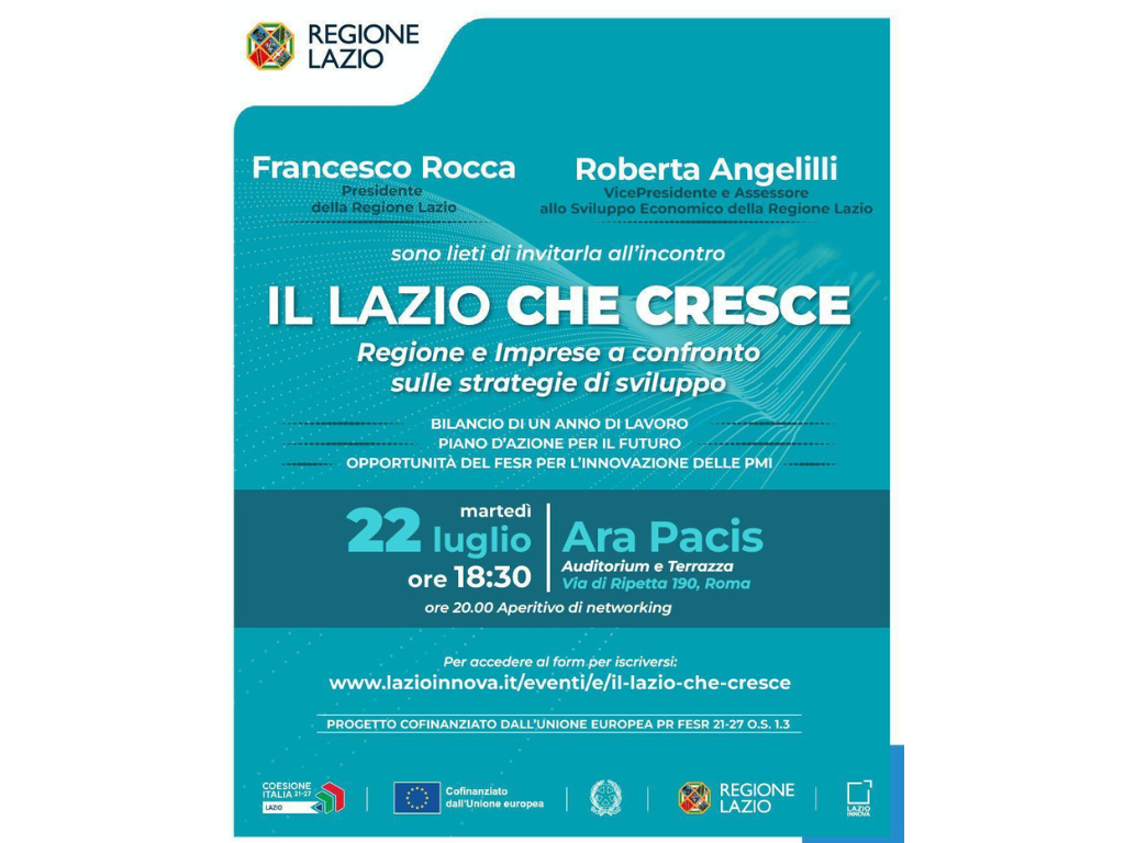 Martedì 22 luglio alle ore 18:30, presso il Museo dell’Ara Pacis (Lungotevere in Augusta, entrata da via Di Ripetta 190 a Roma), la Regione Lazio presenta “Il Lazio che cresce”,…