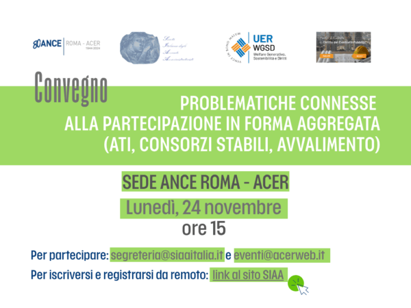 Lunedì 24 novembre, alle ore 15, l’Associazione dei Costruttori Edili di Roma e provincia ospiterà il convegno dal titolo “Problematiche connesse alla partecipazione in forma aggregata (ATI, consorzi stabili, avvalimento)”,…