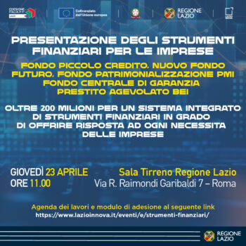 REGIONE LAZIO | Presentazione degli strumenti finanziari per le imprese | LAZIO INNOVA – Giovedì, 23 aprile alle ore 11 – Sala Tirreno della Regione Lazio, in via R. Raimondi Garibaldi 7 (Roma)