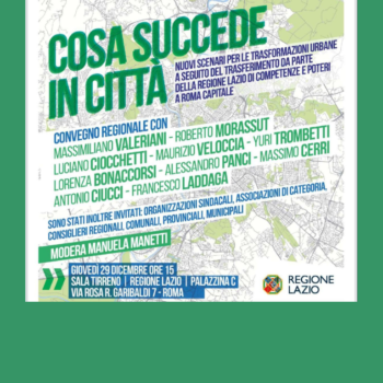 Giovedì, 29 dicembre – alle ore 15 – si terrà presso la Sala Tirreno della Regione Lazio, il convegno “Cosa succede in città. Nuovi scenari per le trasformazioni urbane a seguito…