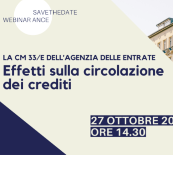 Il prossimo 27 ottobre alle ore 14.30 si terrà il webinar Ance “La CM 33/E dell’Agenzia delle Entrate: effetti sulla circolazione dei crediti” su piattaforma zoom riservata agli associati. Tutti gli…