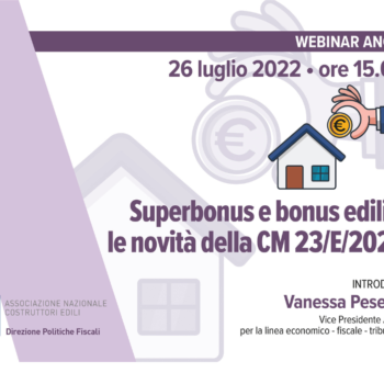 Si terrà il 26 luglio alle ore 15, il webinar “Superbonus e bonus edilizi – Le novità della CM 23/E/2022”, organizzato da Ance per fare il punto sulle linee interpretative fornite…
