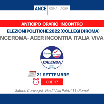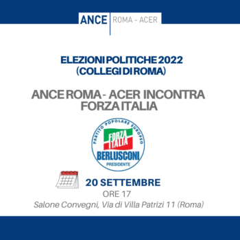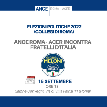 In vista delle elezioni del 25 settembre, Ance Roma – ACER incontra i candidati nei collegi romani appartenenti alle diverse forze politiche: primo appuntamento, giovedì 15 settembre alle ore 18,…