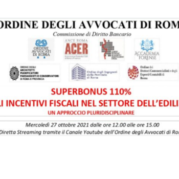 Mercoledì 27 ottobre, alle ore 12 si terrà il convegno pluridisciplinare: “Superbonus 110% – Gli incentivi fiscali nel settore dell’edilizia, un approccio pluridisciplinare” presso la Corte di Cassazione – Aula…
