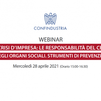 Mercoledì, 28 aprile 2021, dalle ore 15.00 alle ore 16.30 si terrà, a cura della Confindustria, il webinar on line: “Crisi d’impresa: le responsabilità del Cfo e degli organi sociali…