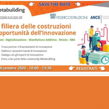Il prossimo 11 dicembre 2020 alle ore 10.00, tramite la piattaforma zoom, si terrà il primo evento pubblico di presentazione del progetto europeo METABUILDING a cui partecipano Ance e Federcostruzioni…