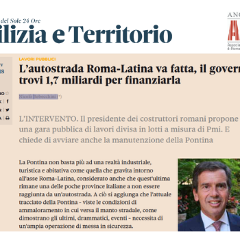 Oggi, con una lettera al quotidiano Edilizia e Territorio, Nicolò Rebecchini – Presidente dei costruttori romani – propone per la realizzazione dell’autostrada Roma Latina una gara pubblica di lavori, divisa…