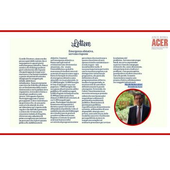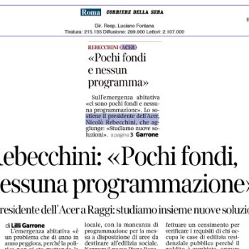 Emergenza abitativa, a Roma. Oggi l’intervista del Presidente ACER, Nicolò Rebecchini, sulle pagine dell’edizione romana del Corriere della Sera. Rebecchini interviene sulla questione e propone alla Sindaca, Virginia Raggi, di studiare insieme…
