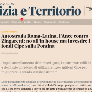 Dopo l’annullamento della maxi-gara, i costruttori edili di Roma e del Lazio chiedono di utilizzare i 460 milioni Cipe, per migliorare la strada statale esistente. Oggi, online, sul quotidiano del Sole…