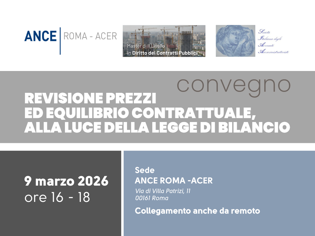 ANCE ROMA – ACER, SIAA (Società Italiana Avvocati Amministrativisti) e il Master Contratti pubblici UER – SIAA (diretto da Arturo Cancrini, Loredana Giani e Filippo Lubrano) organizzano in collaborazione un convegno sulla revisione dei prezzi e sull’equilibrio contrattuale, alla luce della legge di bilancio. L’appuntamento è per lunedì 9 marzo, alle ore 16 nella sede della nostra Associazione, in via di Villa Patrizi 11 – Roma. Per parteciapare, scriveteci a lavoripubblici@acerweb.it Le iscrizioni sono aperte anche sul sito SIAA in sezione “Convegni”. Nei prossimi giorni seguirà il programma con tutti i dettagli e gli interventi previsti