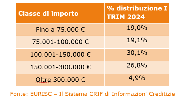 Infine, le previsioni di mercato fissano per giugno 2024 un abbassamento dei tassi, e tale scenario solleverà ulteriormente i mutuatari, riducendo la pressione e contribuendo a stabilizzare la situazione finanziaria.Riguardo alla distribuzione per fascia di importo, nel primo trimestre del 2024 le richieste di mutuo per importi compresi tra 100.000 e 150.000 euro restano ancora la soluzione preferita dalle famiglie italiane per il 30,1% del totale, un dato sostanzialmente in linea con il corrispondente periodo del 2023.