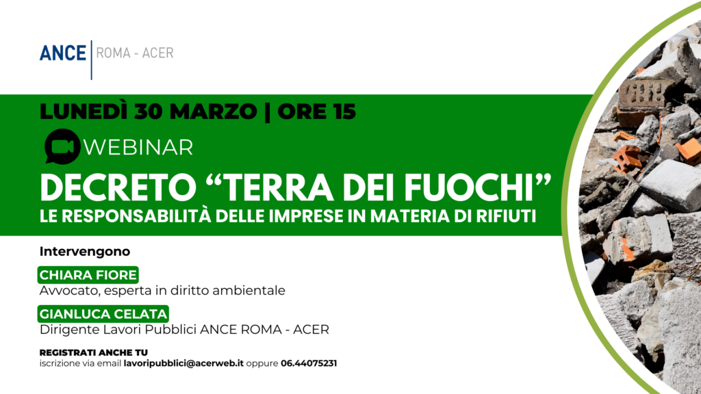 Decreto “Terra dei Fuochi” | Webinar ANCE ROMA – ACER sulle responsabilità delle imprese in materia di rifiuti | Lunedì 30 marzo, ore 15 – Zoom
