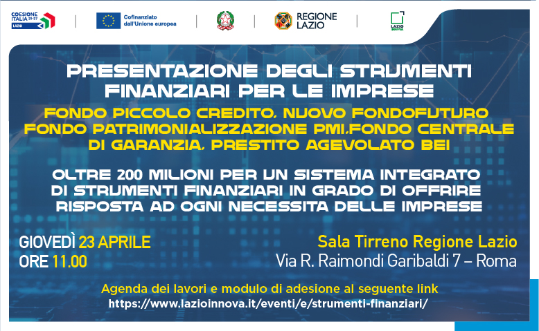 Giovedì 23 aprile, la Regione Lazio presenta l’apertura degli strumenti di Finanza Agevolata per le PMI regionali. Si tratta di oltre 200 milioni in grado di offrire risposta ad ogni necessità delle imprese, divisi tra i seguenti strumenti: Piccolo Credito, Nuovo Fondo Futuro, Patrimonializzazione, Fondo di Garanzia, Finanza Agevolata BEI. L’appuntamento è alle ore 11:00 a Roma con un caffè di networking, presso la Sala Tirreno della Regione Lazio, in via R. Raimondi Garibaldi 7. A seguire, conferenza stampa fino alle ore 13:00. Per programma e iscrizioni: https://www.lazioinnova.it/news/presentazione-degli-strumenti-finanziari-per-le-imprese/