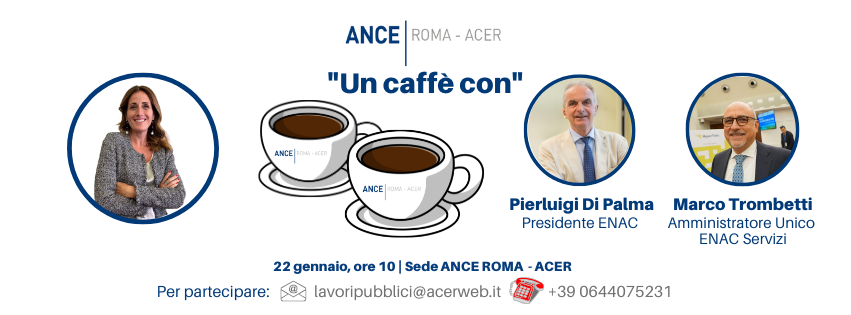 Anche nel 2026 proseguono gli incontri di “Un caffè con” in Associazione. Giovedì, 22 gennaio – alle ore 10 – gli imprenditori ANCE ROMA – ACER incontreranno il Presidente di ENAC, Pierluigi Di Palma e l’Amministratore Unico di ENAC Servizi, Marco Trombetti. Per partecipare, è a disposizione l’Ufficio Lavori Pubblici: si può inviare una email all’indirizzo lavoripubblici@acerweb.it oppure chiamare 06 44075231